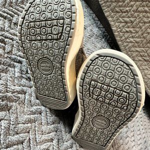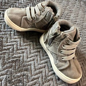 Gently used easy to put on and easy to take off, gray sneakers! These are the great first walking shoes since they are wider for the toes to move!