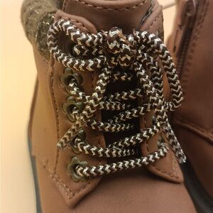 Chic tan boots with cozy knit trim. Durable laces for secure fit. Ideal for playtime.