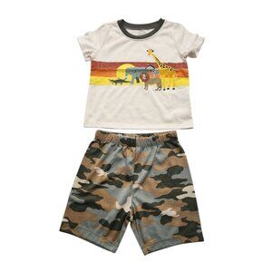 The Wonder Nation Toddler Boys Animal Print Pajama Set includes a tank, t-shirt, short, and pant. Made from polyester blended fabric, this 4-piece set features a pullover closure and is machine washable for easy care. The multicolor design with an animal theme makes it perfect for casual occasions in spring, while the short sleeves and comfortable material ensure your little one is cozy and active during playtime. The set is designed for boys in size 2T, offering a fun and stylish outfit for your toddler.