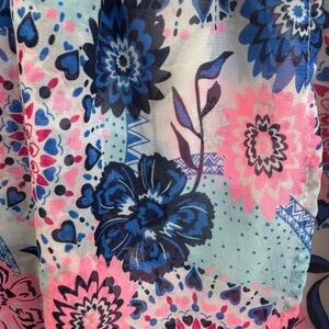 Stylish dress with navy lace top. Features a floral skirt in pink and blue. Ideal for casual outings.