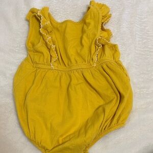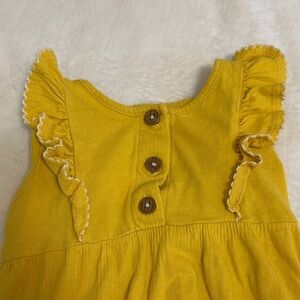 Charming yellow bodysuit with ruffle sleeves. Features button details and snap closure. Perfect for everyday wear.