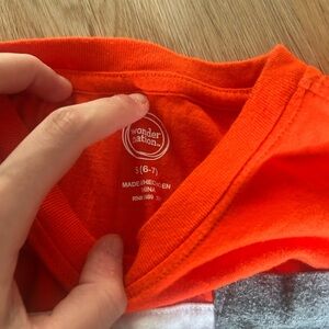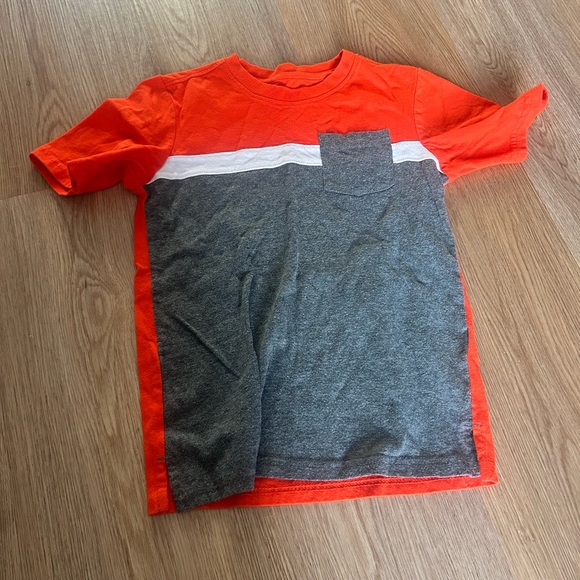 Vibrant orange and gray tee with a stylish block design. Features a convenient chest pocket. Ideal for casual wear.