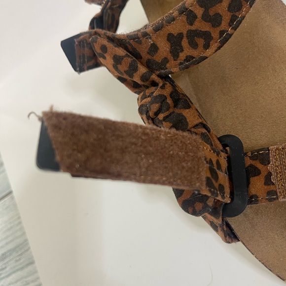 Leopard print, hook and loop closure, twisted bow on sides, no mark soles, colors may vary due to lighting, good used condition, girls size 3
