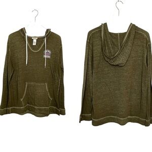 Cute and fun Wonder Woman pajama set with shorts and a hoodie in a khaki burnout fabric. The hoodie has a kangaroo pocket and hood with ties and a “Love Truth Justice” patch. Drawstring shorts say “Hero”. Fun loungewear! Good pre owned condition. Size L.