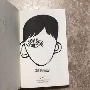 Wonder by: R.J Palacio. This hard cover book is a great read. There’s a name on the inside cover as well as some highlighting on the first chapters but does not interfere with the story or the words.