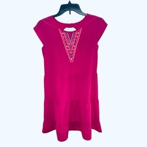 A very vibrant pink lightweight dress. Aztec pattern on the front and strap across the back of the neck that adds character. Like new condition.