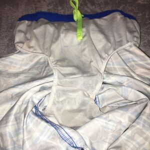 Cute pair of boys swim trunks. Elastic tie front. Mesh on the inside. Velcro pocket. No holes, stains, or rips.