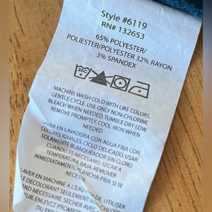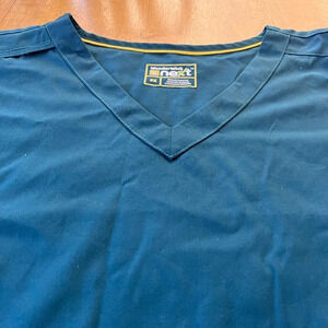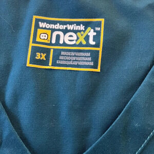 WonderWink Next deep blue/green scrubs top, size 3X. This top has two front pockets that accommodate necessary items. There are no holes, rips or stains.