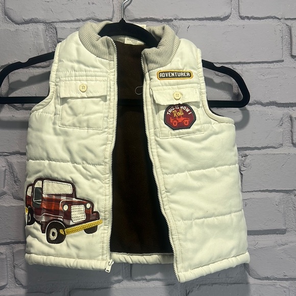 Stylish cream vest with brown interior. Features fun car patches. Perfect for adventurous kids.