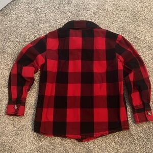 Red and black Buffalo plaid shirt. Button front. Front chest pocket.