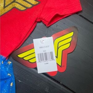 Vibrant red bodysuit with gold emblem. Blue tutu with gold stars. Ideal for play and parties.
