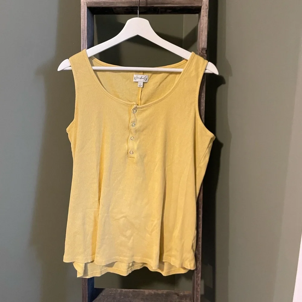 Brand new without the tags ribbed tank from Wonderly. Size large, originally $36.50. Front snap button closure on ribbed yellow tank. Perfect basic for building your wardrobe.