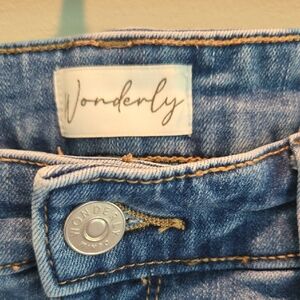 Wonderly light wash blue jean shorts. Cotton with spandex for a stretchy comfortable fit. Features a rolled hem and distressed details. Perfect for casual wear.