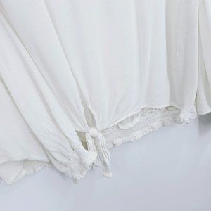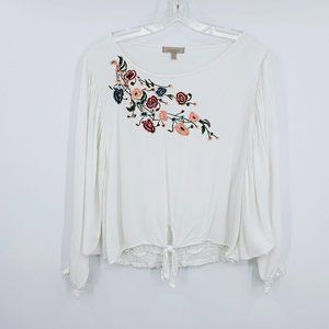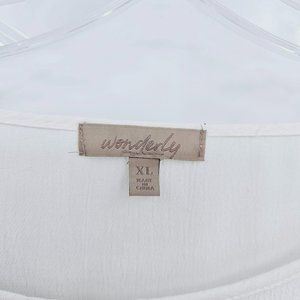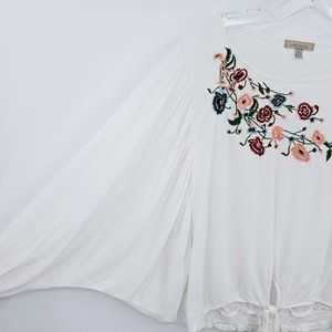 Wonderly Peasant Top XL White Pink Embroidered Floral Crinkle Batwing Tie Waist