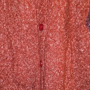 Marled knit button-up cardigan in warm rust. Crew neckline and long sleeves. Soft, lightweight knit for layering. Simple ribbed hem and cuffs.