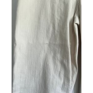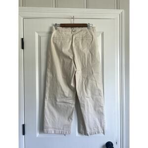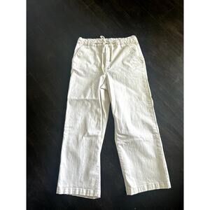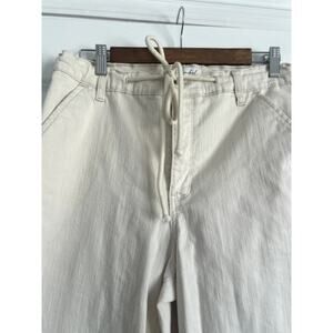 From Wonderly...Wide leg cropped jeans in a cream color. The top has a tie waist, and a button and zipper closure. Pockets are present at the hip and on the back.