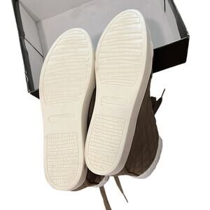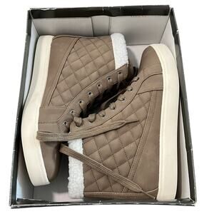 Taupe quilted faux suede high top sneakers with Sherpa along top edge, lace up