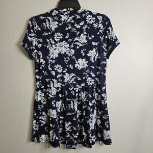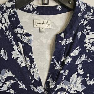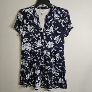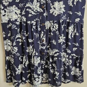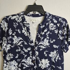 Wonderly Women's S Tiered Tunic Top Blue Floral ButtonDown Short Sleeve V-neck