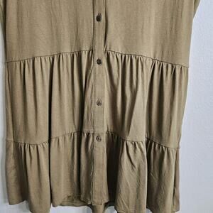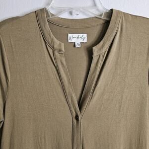 The Wonderly Women's S Tiered Tunic Top is a stylish and versatile piece perfect for travel, casual outings, or workwear. This brown button-down top features a V-neckline, short sleeves, and a flowy design, giving it a bohemian and peasant-inspired vibe. Made of knit viscose fabric, this tunic is easy to care for and suitable for wearing in the summer, fall, or spring seasons. With pleated and ruffle accents, this blouse from Wonderly offers a comfortable regular fit in size S. Ideal for those looking for a cute and trendy addition to their wardrobe. Like new condition.
