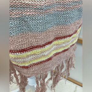 Beautiful subdued palette of mauve, blue/ gray, yellow and brick red linger open cardigan or duster. Longer length, great pockets and fringed bottom. Put to pit 23” fully closed. Shoulder to hem 35” before fringe and 38” with. Very Good used condition. Lovely fabric, weave. Very minor tiny irregularity in weave not noticeable. Purchased at Belks.