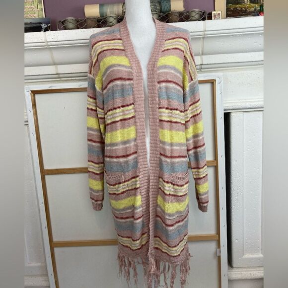 Beautiful subdued palette of mauve, blue/ gray, yellow and brick red linger open cardigan or duster. Longer length, great pockets and fringed bottom. Put to pit 23” fully closed. Shoulder to hem 35” before fringe and 38” with. Very Good used condition. Lovely fabric, weave. Very minor tiny irregularity in weave not noticeable. Purchased at Belks.