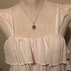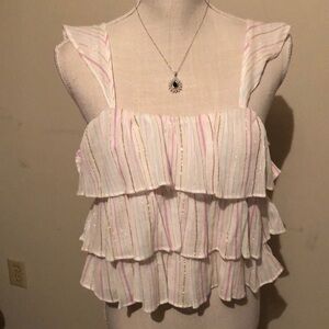 Wonderly tiered ruffle crop top in pink, blue and white with metallic threads . X Sm. Straps with ruffle. Elastic around bodice. Nwot