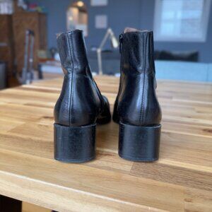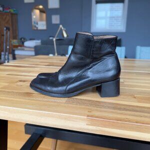 Elegant black leather ankle boots by Wonders, made in Spain. Sleek almond toe silhouette with a low block heel and side zipper closure. Smooth leather upper with subtle creasing from gentle wear. Fully lined in soft leather with lightly cushioned insoles. Durable rubber soles show minimal wear. Size 40 (approx US 9–9.5). See photos for condition details. Offers are always welcome! :)