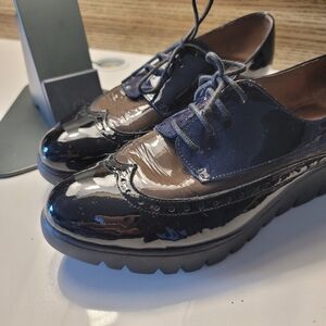 Womdersfly patent leather lace-up wedge Brogues Oxfords in excellent condition. Color - Black/Navy/Green. Size - 40 EU. Made in Spain. 2" heel and 1" platform. Style C 3350.