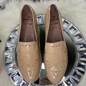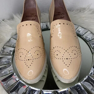 Wonders fly lightweight but elevated loafer with a funky sole. The Nude patent leather upper has small perforations to create an elegant design on the forefoot. Lined with leather and a lightly cushioned footbed with memory gel. The sole is light with some flexibility and a slight rocker sole. 2 inch heel with 1 inch platform. Wonders shoes are made in Spain and are recognized for their statement sole and patent leathers. In excellent condition. Size 40 fits true to size, medium width. Fits 9-9.5 US