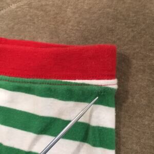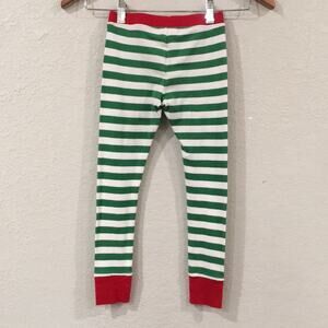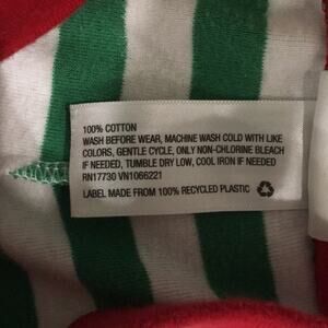 Small repaired hole from tag near waistband and light wash wear. The pajama pants are in Good Condition. Green and white stripe pattern with red accent waist and cuffs. Winter. Fall. Unisex. Breathable cotton. Christmas. Holiday.