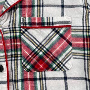 SHIRT ONLY. Button up long sleeve pajama shirt with notched collar, buttons, chest pocket, contrast piping detail. Soft and lightweight flannel material. Festive plaid for the holidays, Christmas, or all year round.