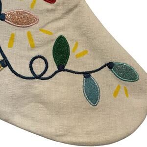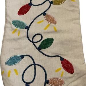 Good preowned condition, canvas stockings with glittery embroidered Christmas lights, standard size stocking