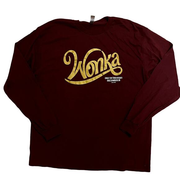Excellent condition long sleeve shirt made in promotion for WONKA! Maroon-ish purple with gold text. Size XL, see pictures for measurements and details.