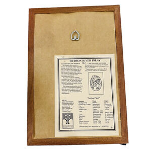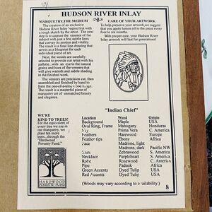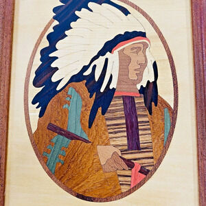 Stunning wood art by Hudson River Inlay artist Nelson - features an intricate marquetry design called "Indian Chief" that is sure to impress. The framed art is signed by the handcraft artist and framed in a simple wooden frame. Ready to hang - includes a full explanation of the wood used in the piece on the back - amazing work - sure to be a treasured keepsake for years to come. Don't miss out on the opportunity to own this remarkable piece of wood art today! Pre-owned in excellent condition - substantial weight for size.