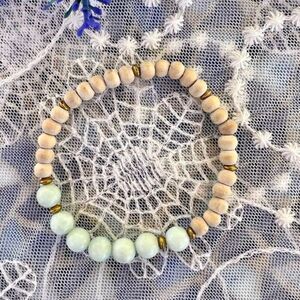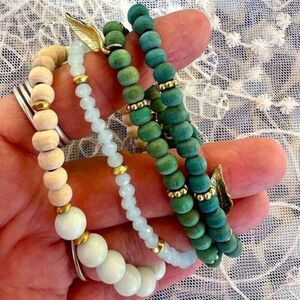 4 stretchy bracelets in blue, green, cream & gold tones.