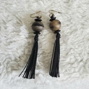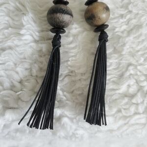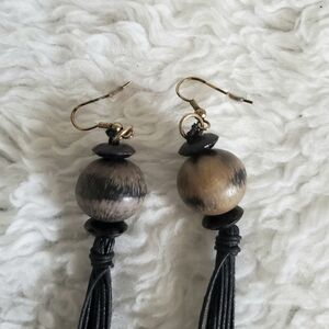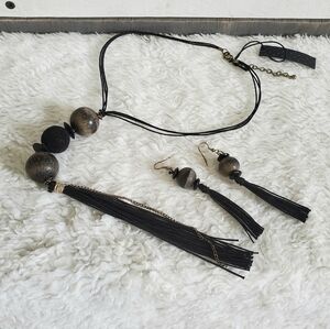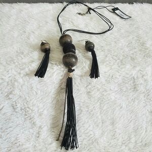 NWT Wood beaded chunky necklace and earring set. Colors of tan and black beads with bronze accents. Both are lightweight, adjustable necklace from 18" to 22", front length from top bead is 10" with matching 3.5" earrings. Brand new with tags!