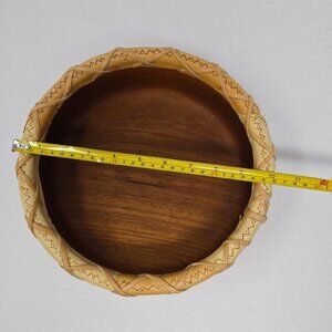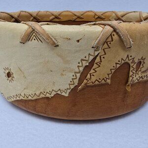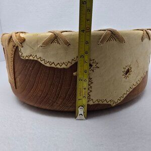 Wood Bowl 12" Leather Overlay Handmade Possibly Native American Round Wooded