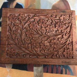 Wood Box Hand Carved Jewelry Trinket flower design Made in India 6” x 4”x2”