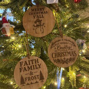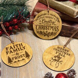 This set of 3 country-style holiday ornaments are laser-engraved in our home studio on natural basswood, then lightly stained to bring out the warm grain. Each one has that cozy, farmhouse-Christmas feel—simple, heartfelt, and made to be part of your traditions year after year.