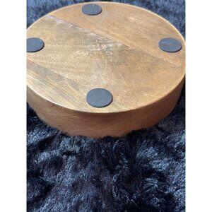 This wood candle holder features a round design with a metal plate, providing a stable and heat-resistant surface for candles.