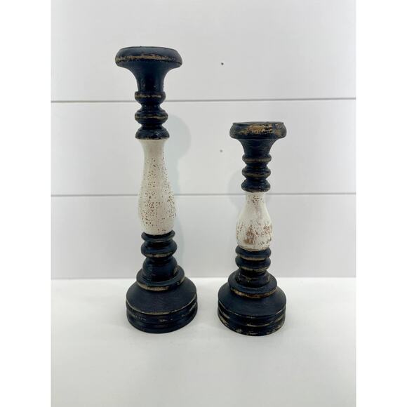 Wood Candle Holders Black White Farmhouse Distressed Chunky - Set of 2