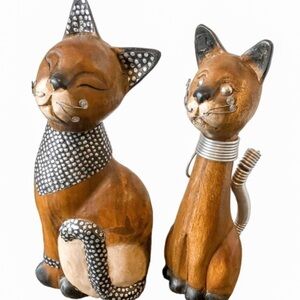 Set of 2 Wood Carved Cats with Metal Accents