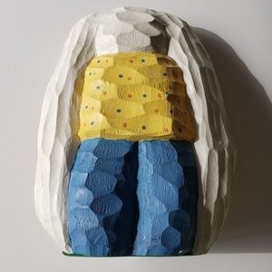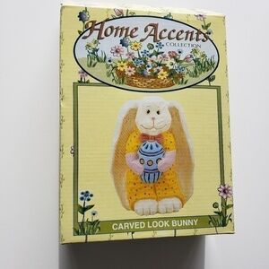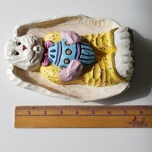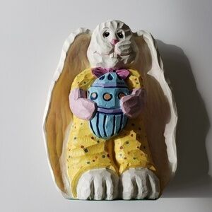 Wood Carved Looking Bunny Rabbit With Big Ears Holding Easter Egg 7" Tall Resin