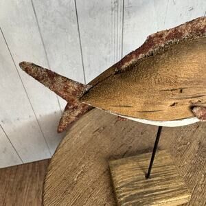 A decorative fish from our Beach Collection displaying a driftwood inspired design made of natural wood with painted accents and distressed details. Decorative fish features aged metal fins and sits on a metal stake attached to a wood base for a floating appearance. Our Fish sitter is designed to free-stand on any flat surface making it easy to display. A rustic beach-themed home accent that coordinates well with primitive home décor.