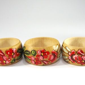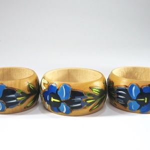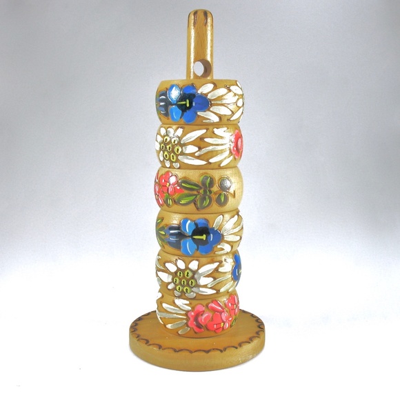 Vintage set of six stacking napkin rings on a display stand. They’re made of natural wood with a hand-painted floral design. Each ring is about 2” across the center x 1” high and has either blue and white flowers or pinkish red and white with green leaves.