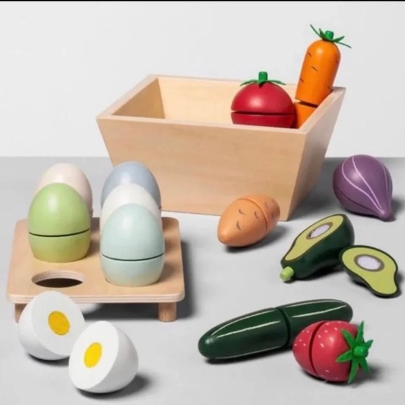 •28 piece wooden fruits and vegetables set with basket and little egg carton set
