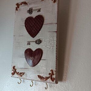 Wood Key Holder. Crackle Paint on Wood with Resin Hearts & Metal Keys. Handmade.