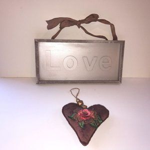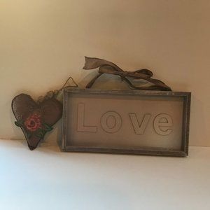 Wood LOVE Sign Champagne Color and Fabric Heart Ornament with Pink Rose Gold Fl