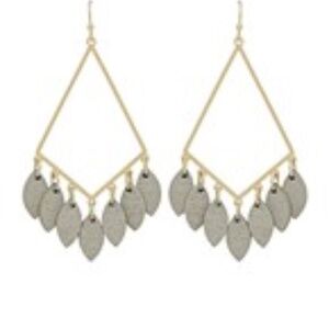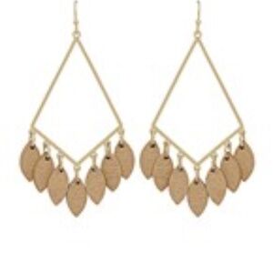 Diamond-shaped earrings featuring wooden leaf decorations, crafted with metal and secured with fish hook clasps, measuring 2.25 inches in length.