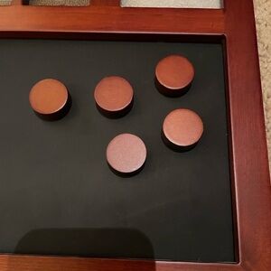 Nicely sized message board/photo frame. Top portion has areas for photos with opening at back. Glass panes. Bottom is a magnet board and comes with 5 round wooden magnets. Two metal hangers at back.